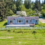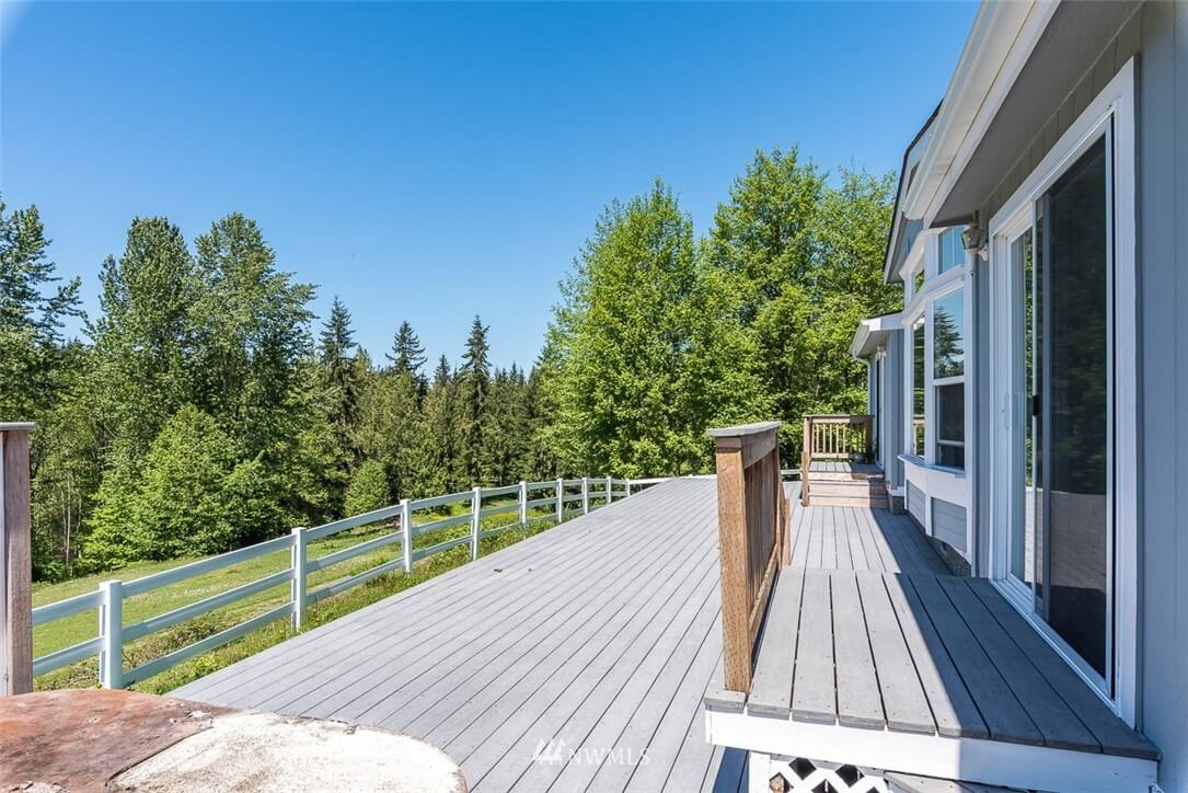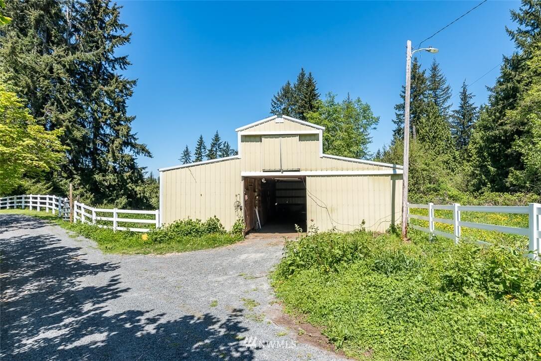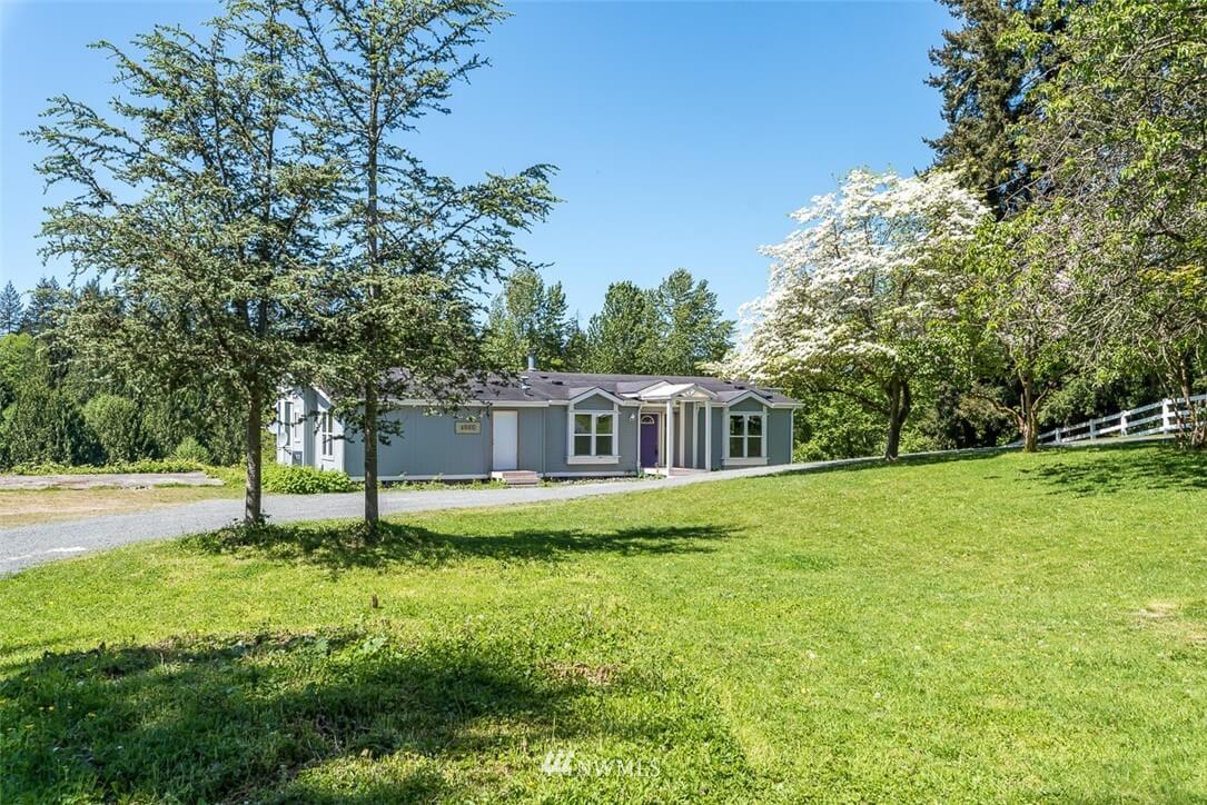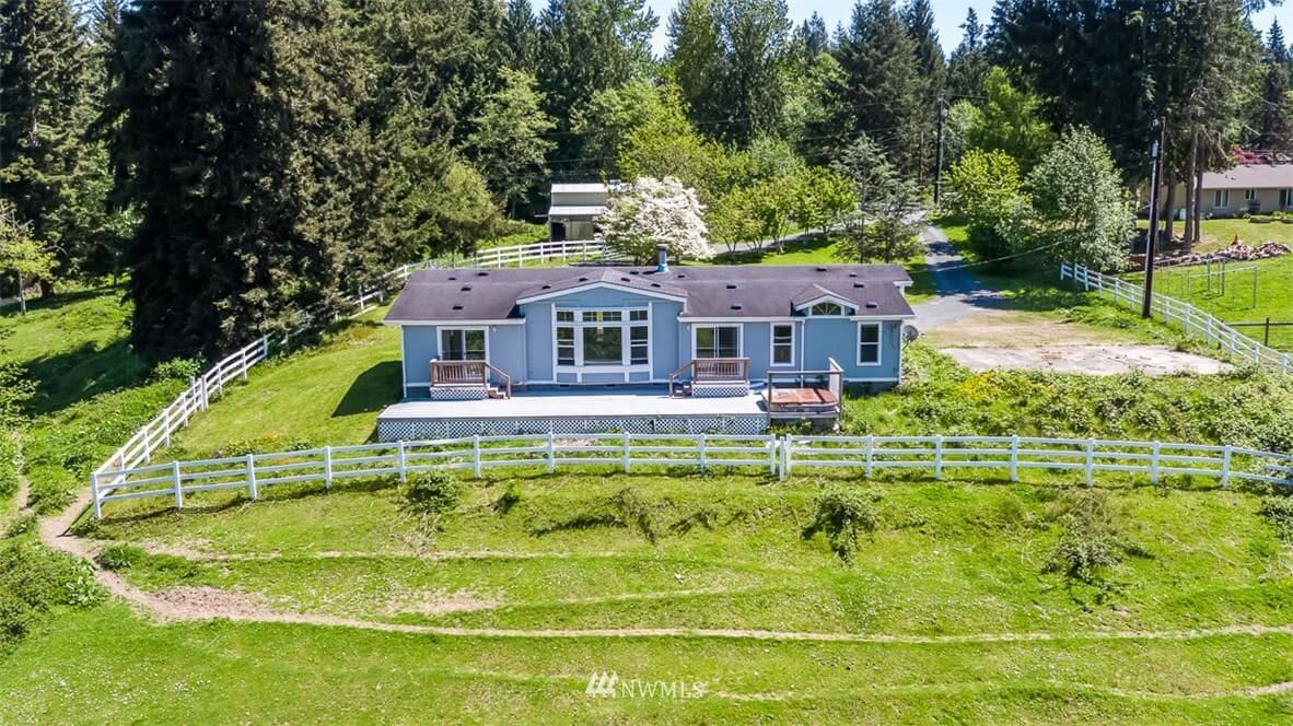 Peaceful hobby farm with a large manufactured home on 5 fenced acres. 2640 square feet, open floorplan, high ceilings, huge rooms, master suite with a bath off master, and an office that could easily be used as a third bedroom. Formal dining room, picture windows, and ample living space. Sit on the back deck and drink in the bright and sunny scenic pasture below, fenced in white vinyl. Concrete slab in place for parking or building a garage. Livestock barn has 5 stalls, 2 of which are oversized birthing stalls, and a tack/equipment room. Plenty of room for gardening, livestock, or a multitude of other hobbies.