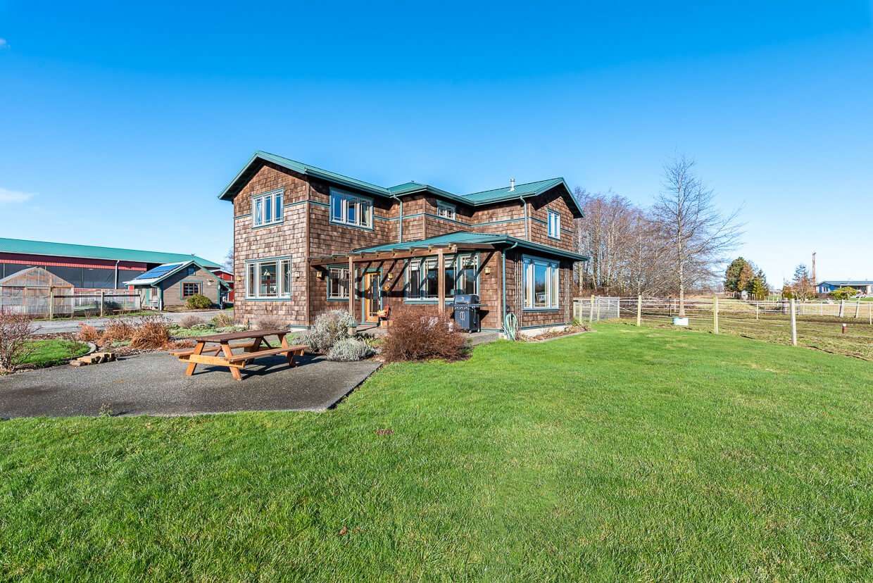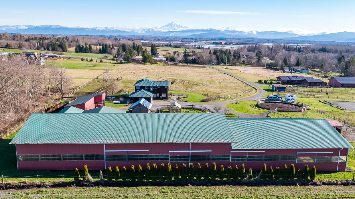 Boasting unobstructed views of Mount Baker and the Twin Sisters, the timeless cedar shingle home offers ample natural light and tasteful wood finishes. Thoughtfully planned, the barn is just steps away with 5 large stalls with automatic waterers, runs, and tack room. 17’X46′ attached, heated storage area. 20′ X 48′ equipment shed with sliding doors. 8’X12′ shavings bunker. Seven large pastures featuring 4 run-in stalls. 62’X192′ indoor arena with raised viewing platform, mirrors, sound system and custom footing. Full court outdoor dressage arena with judge’s booth. 60′ all weather roundpen, compost slab, 16’X20′ garden shed, 12’X16′ greenhouse and fenced garden area.